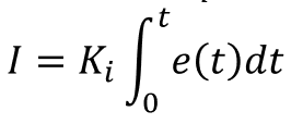 적분항(I)를 수식으로 써 보면 위와 같이 쓸 수 있습니다. 파라미터 Ki에 0부터 t까지 오차(e)를 적분한 값을 곱해버립니다.