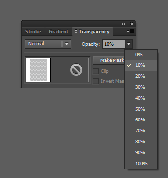 위쪽 패널 Windows 메뉴에서 "Transparency" 메뉴를 선택하면 투명도를 조절할 수 있습니다.