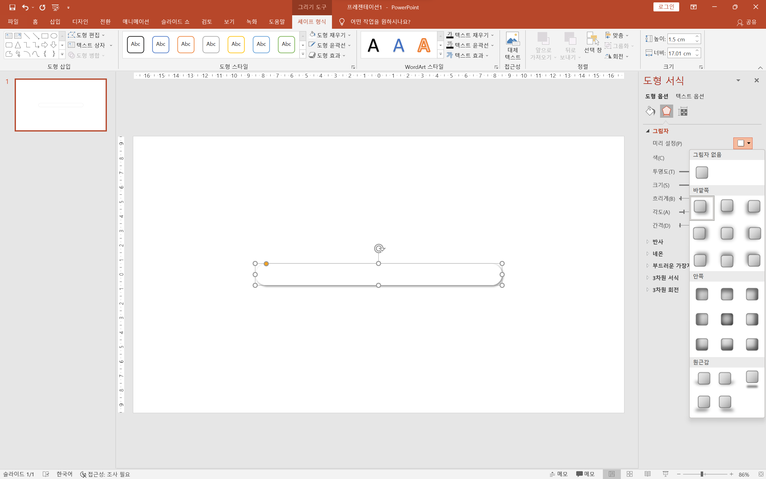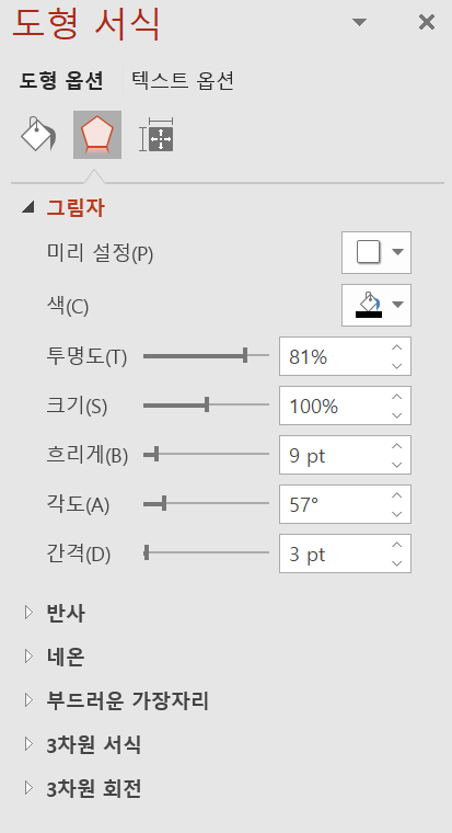 4. 우클릭 - 도형 서식 - 효과 - 그림자 선택 (설정값 참고)