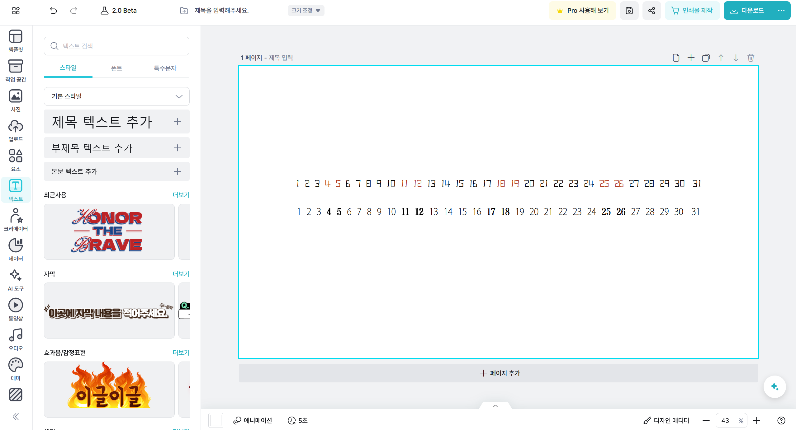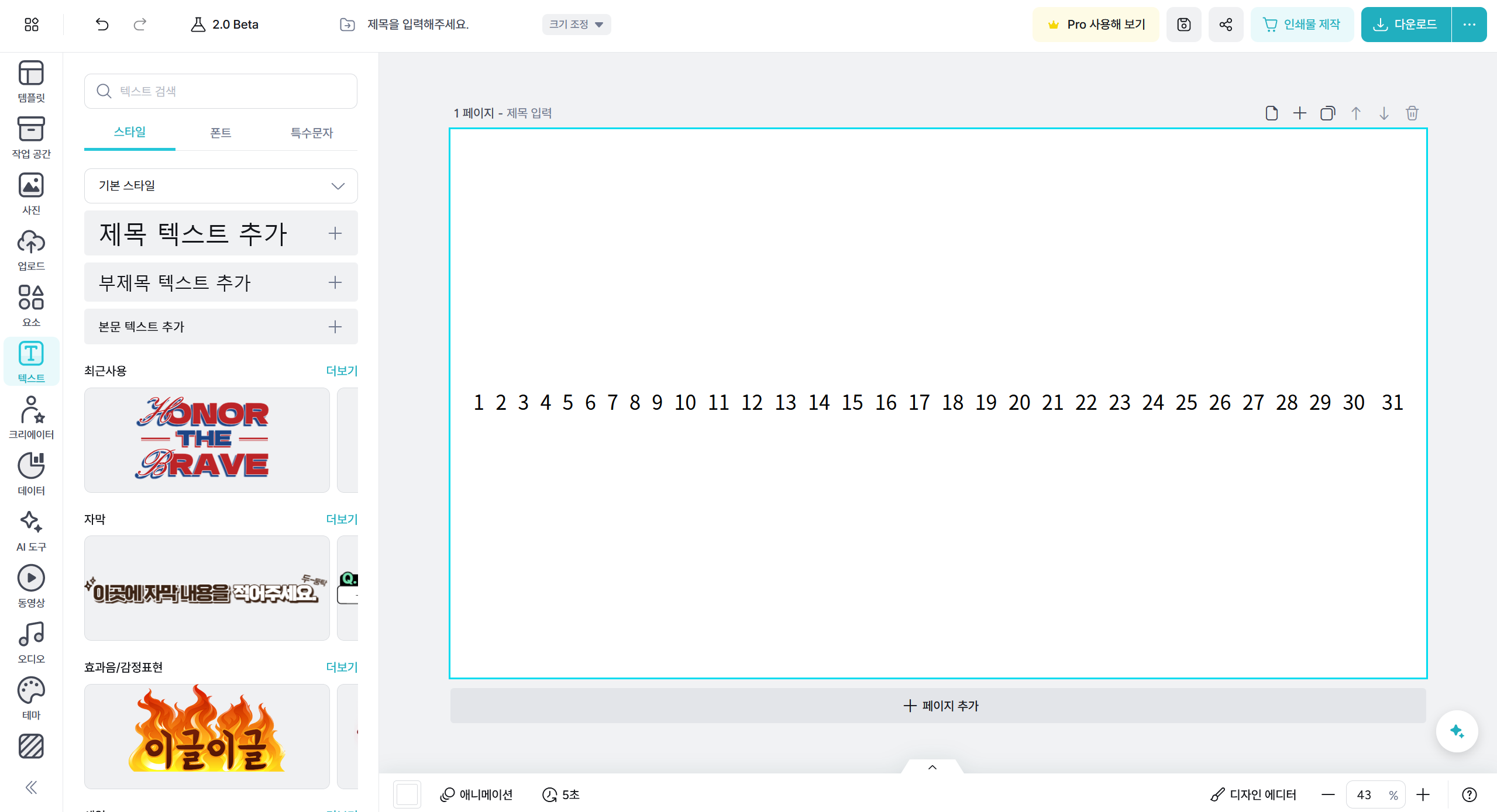 미리캔버스에서 [텍스트 → 본문 텍스트 추가] 클릭하고 날짜들을 쭉 써주면 됩니다~
