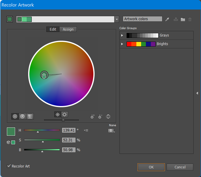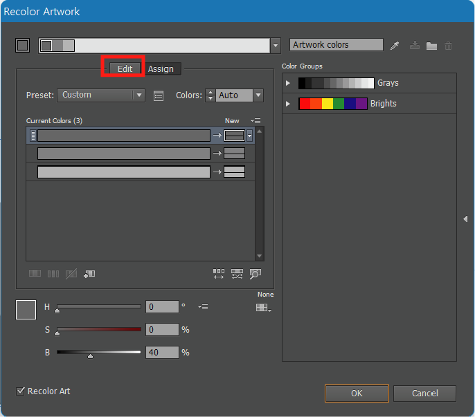 메뉴바에 Edit - Edit colors - Recolor Artwork 에 들어가주세요