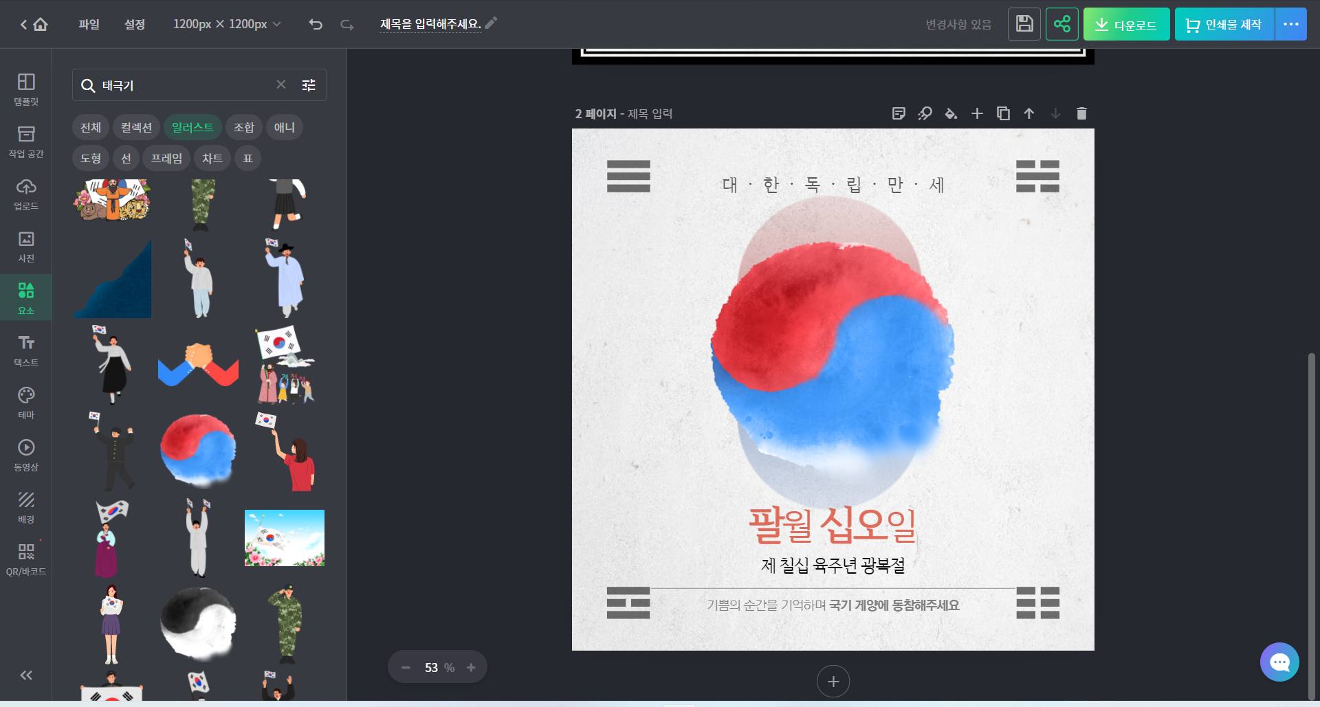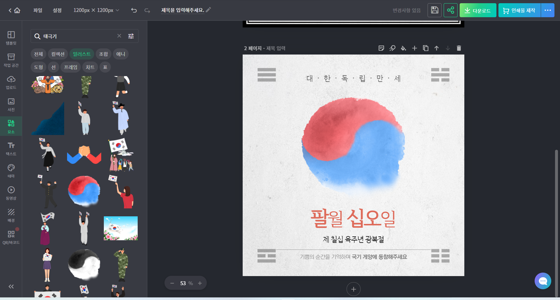 그래서 오늘은 광복절 76주년을 맞아 미리캔버스를 이용해서 간단한 디자인을 해 보도록 하겠습니다.