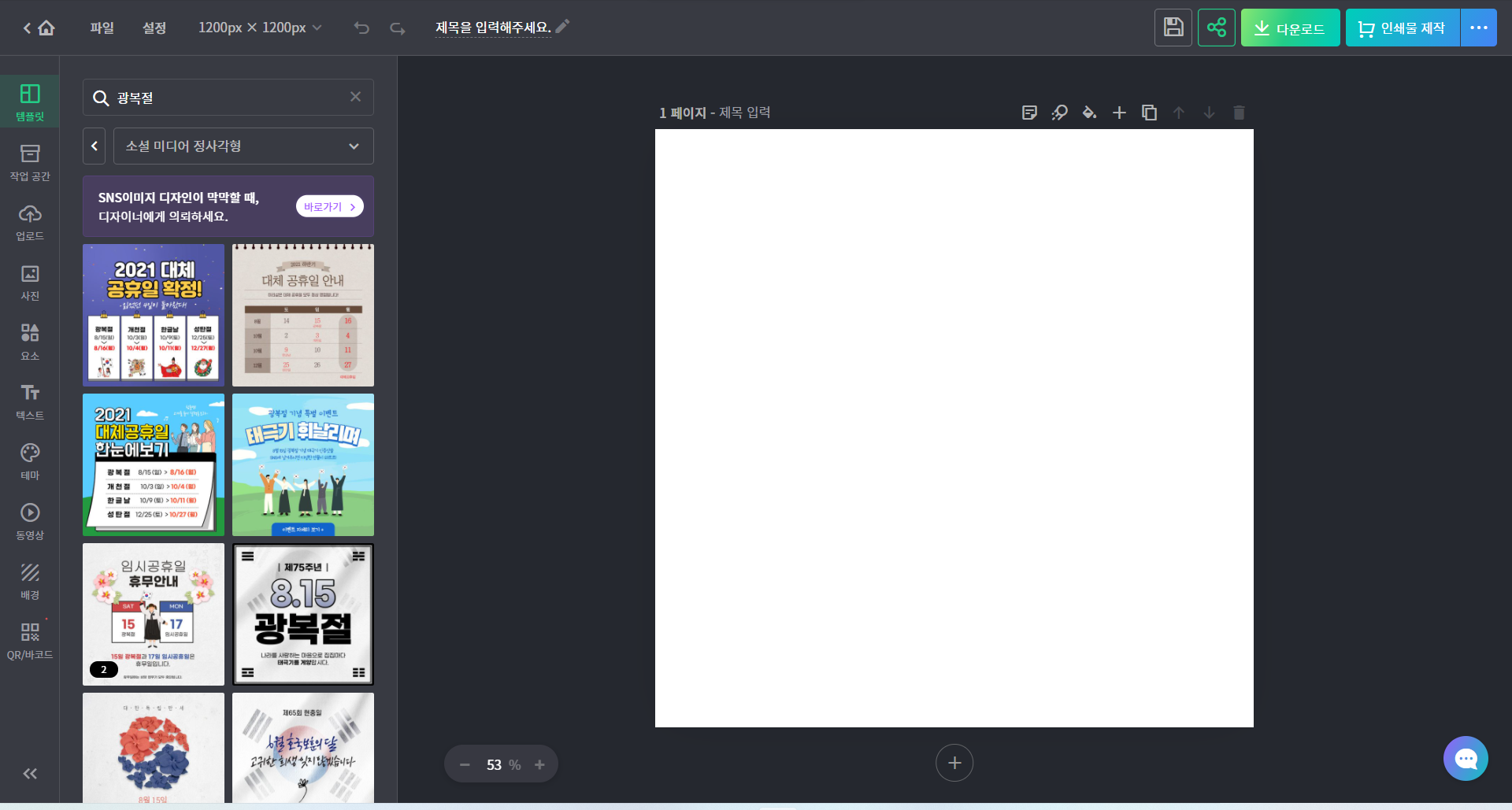 캔버스 사이즈는 소셜 미디어 정사각형인 1200*1200px로 해 줬습니다.