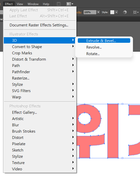 위쪽 메뉴바에 Effect(효과) - 3D - Extrede & Bevel... (돌출)
