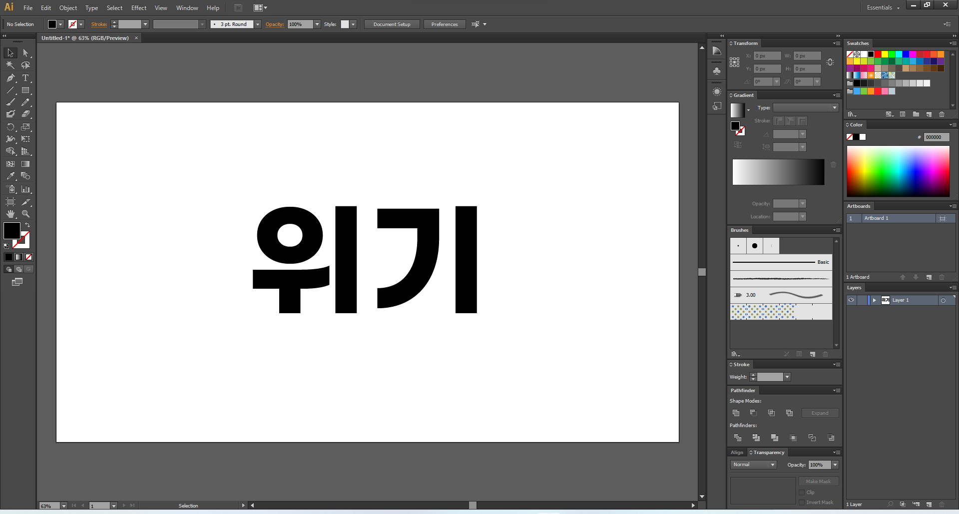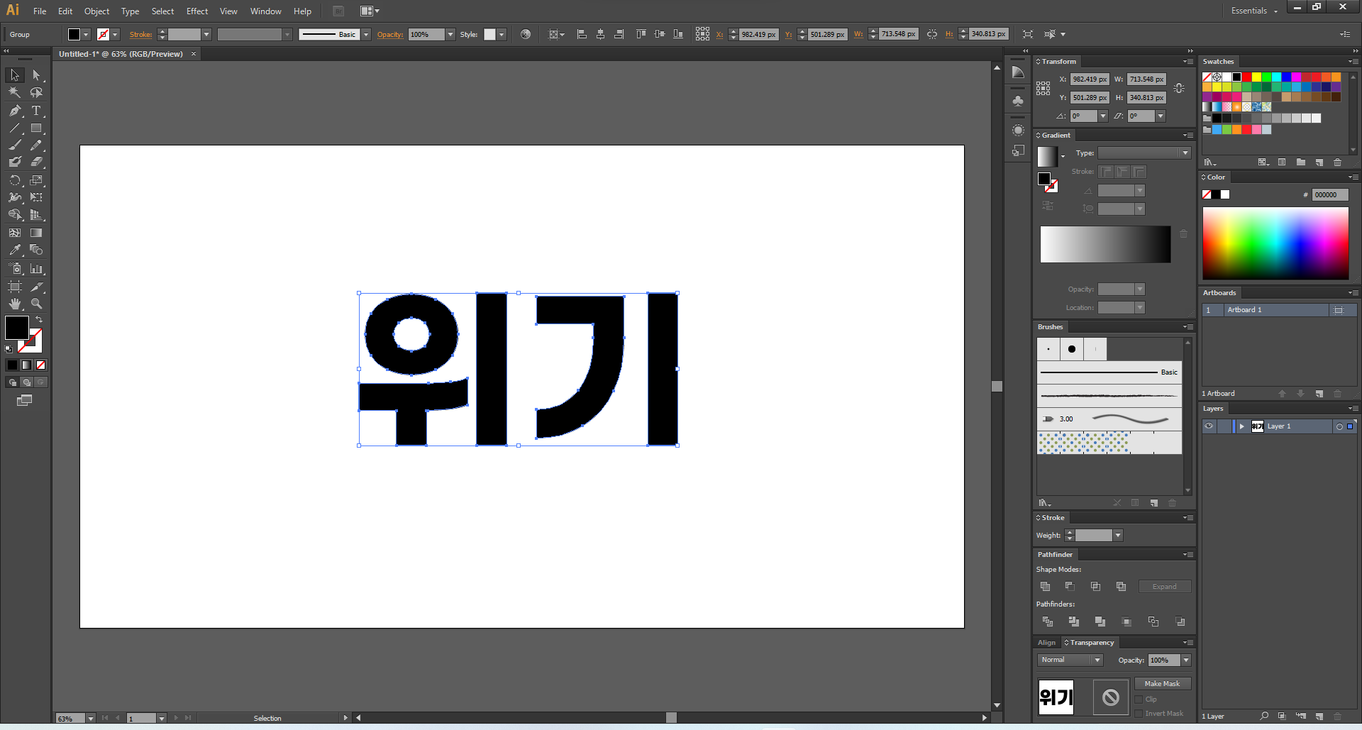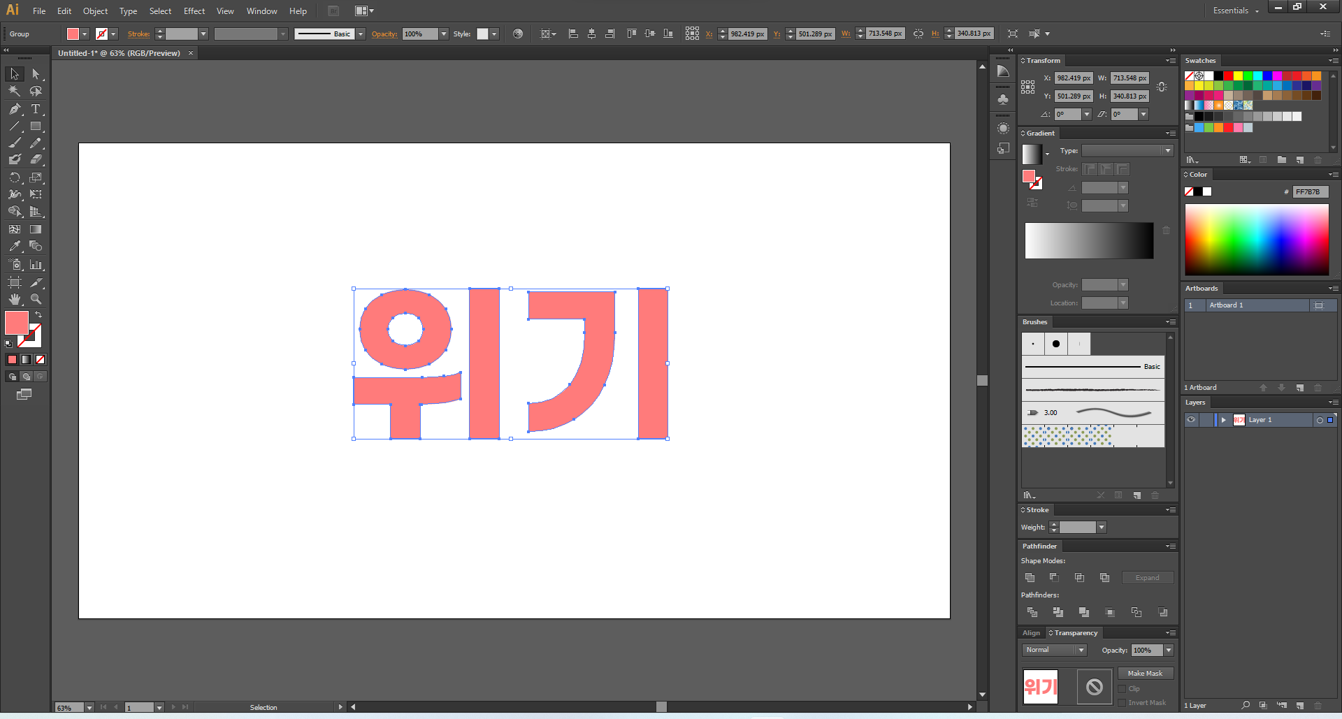 간단하게 텍스트 툴(T) 로 글자를 입력하고, ctrl+shift+O 를 눌러 주면