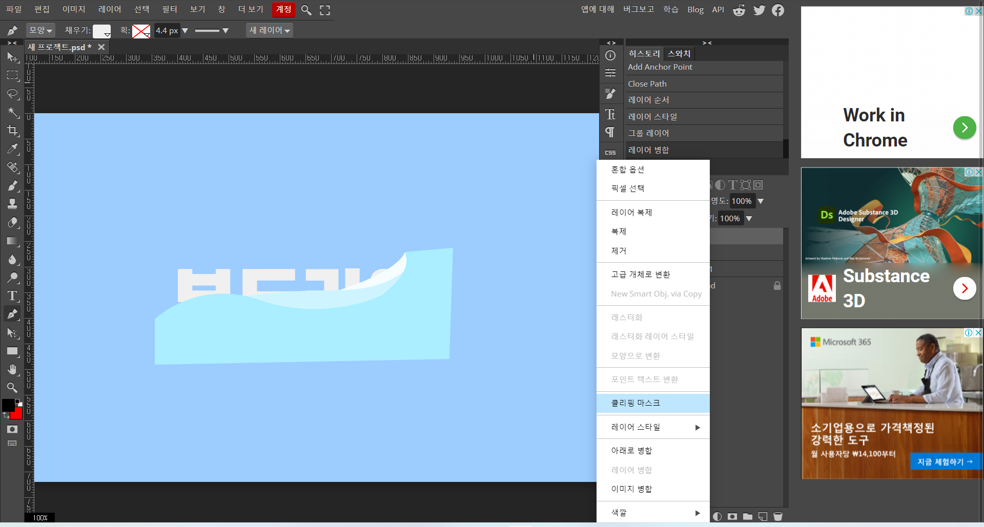 그리고, 텍스트에 넣을 오브젝트를 우클릭 후, 클리핑 마스크를 눌러주세요.