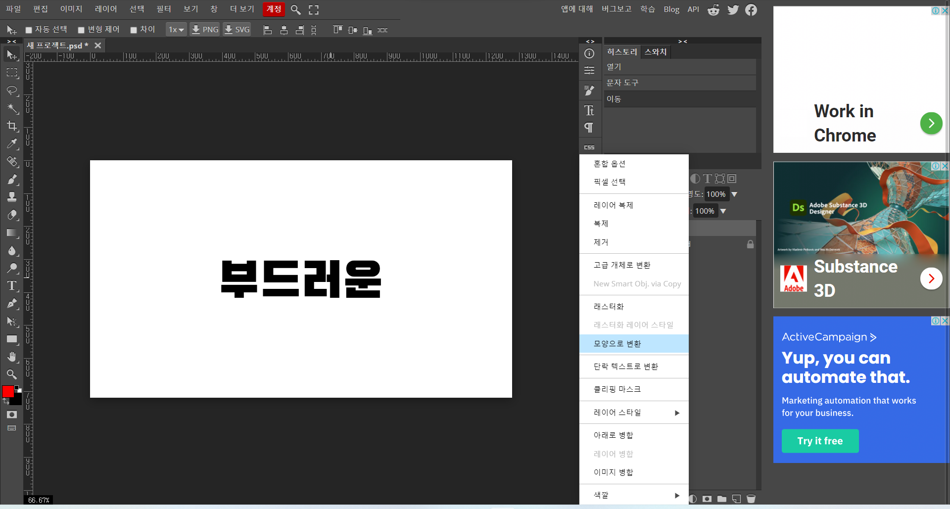 오른쪽 레이어 페널에서 텍스트 레이어를 우클릭 하고, 모양으로 변환을 눌러주세요.