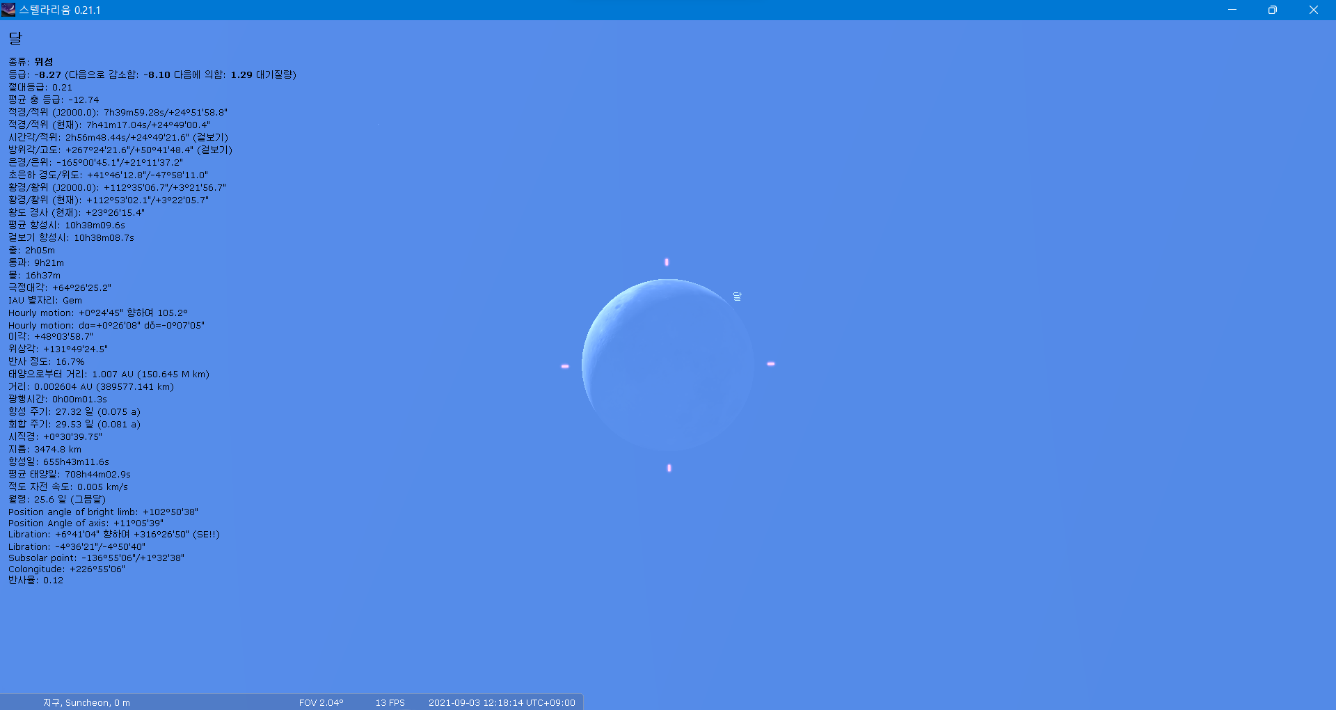 천체가 선택된 상태로 [스페이스]를 누르면 천체를 중앙으로 이동해 주고요,