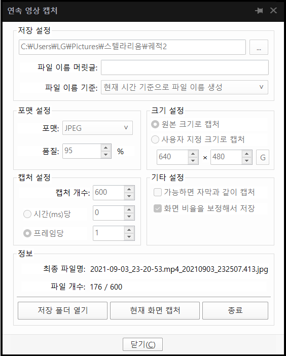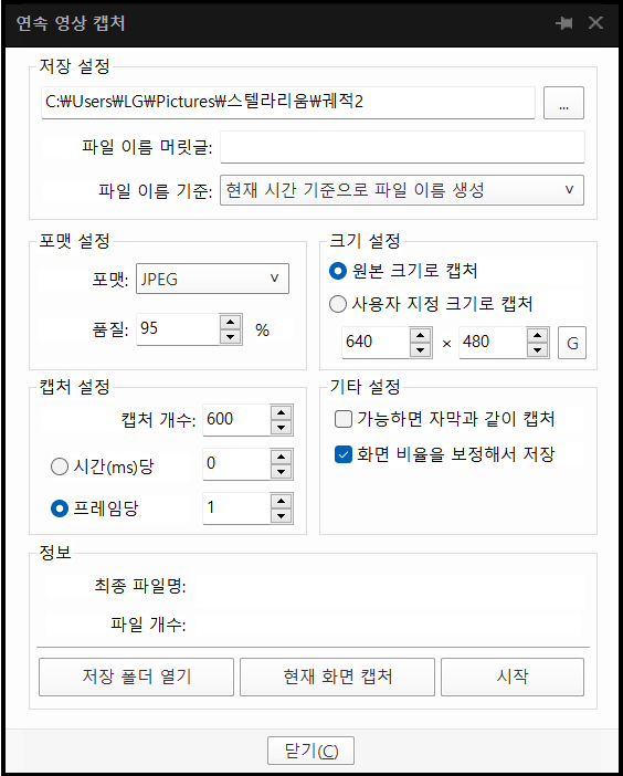 캡쳐 개수는 600개로 설정해 주면 된답니다.
