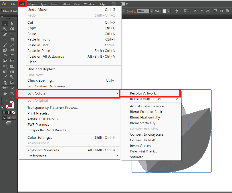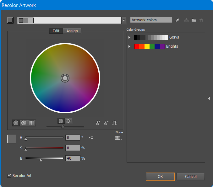 메뉴바에 Edit - Edit colors - Recolor Artwork 에 들어가주세요